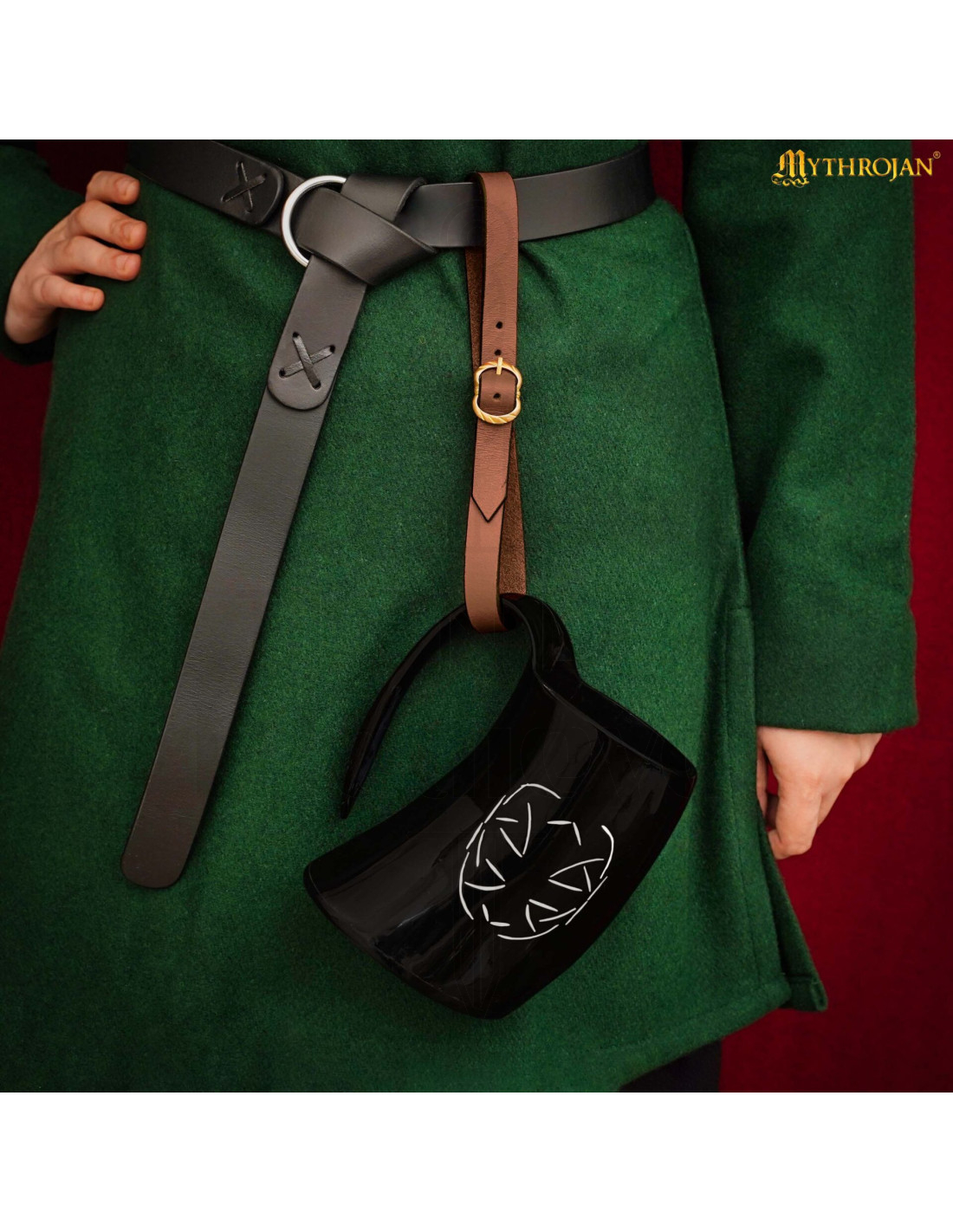 De handgegraveerde geometrische patronen zijn niet alleen decoratie, maar transformeren de hoorn in een object met aanwezigheid, waarvan de reliëfs een omhullende textuur en een symbolische esthetiek bieden die verwijst naar Noordse tradities. Het contrast tussen de donkere tint van de hoorn en het heldere ontwerp aan de voorkant versterkt de visuele impact, perfect voor diegenen die zich willen onderscheiden op banketten, re-enactments of thematische bijeenkomsten.