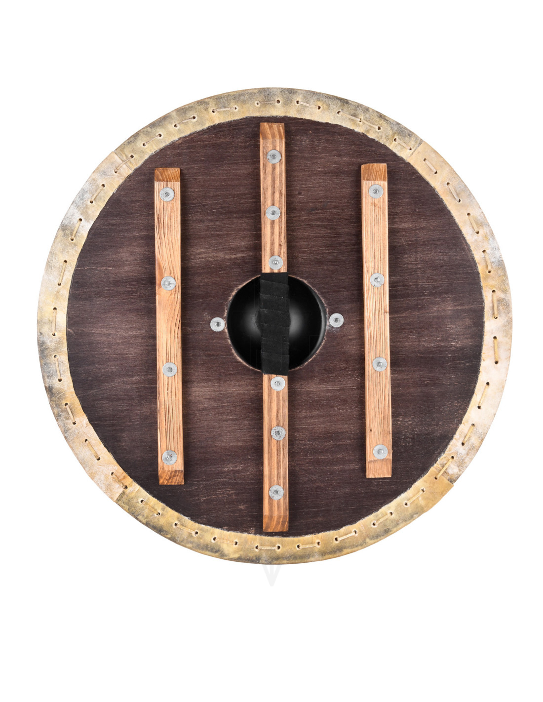 Het schild valt niet alleen op door zijn elegante ontwerp, maar ook door zijn robuuste constructie. Met zijn ruwe leren rand en een versterkt midden dat een stevige stalen knop bevat, voel je je veilig op het slagveld en bij elke feestelijke gelegenheid. De handgreep, omwikkeld met leer, biedt een comfortabele grip, zodat je het gemakkelijk kunt hanteren.