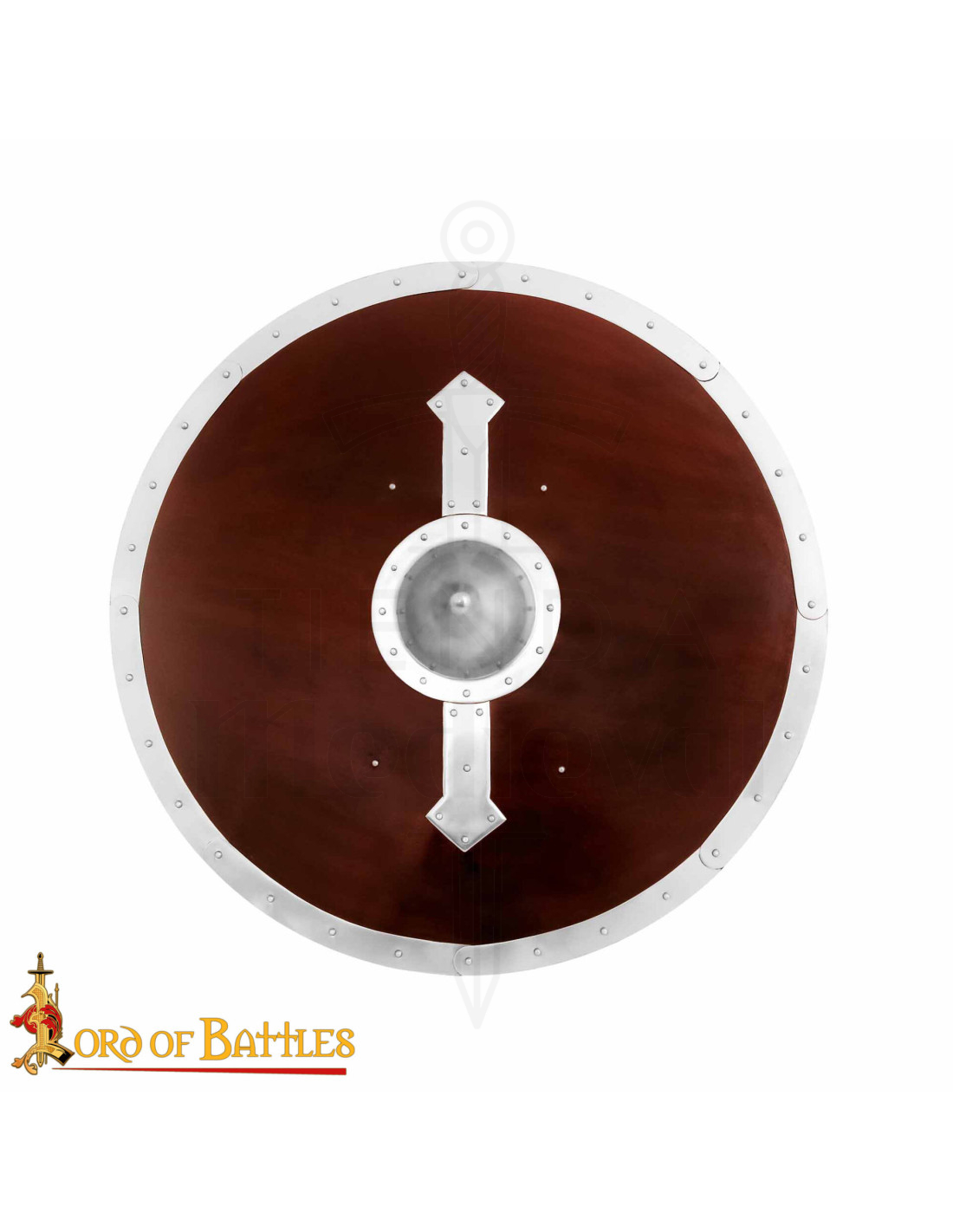 De ambachtelijke constructie in massief hout, versterkt met een gebogen metalen band en een centrale convex umbo, betekent dat je een betrouwbare ondersteuning hebt om manoeuvres te oefenen en schokken op te vangen tijdens recreaties en LARP, zonder in te boeten op een authentieke historische uitstraling. Het verticale metalen stuk met scherpe uiteinden dat door het front loopt, versterkt niet alleen de structuur, maar benadrukt ook de krijgeresthetiek, waardoor een krachtig visueel motief ontstaat.