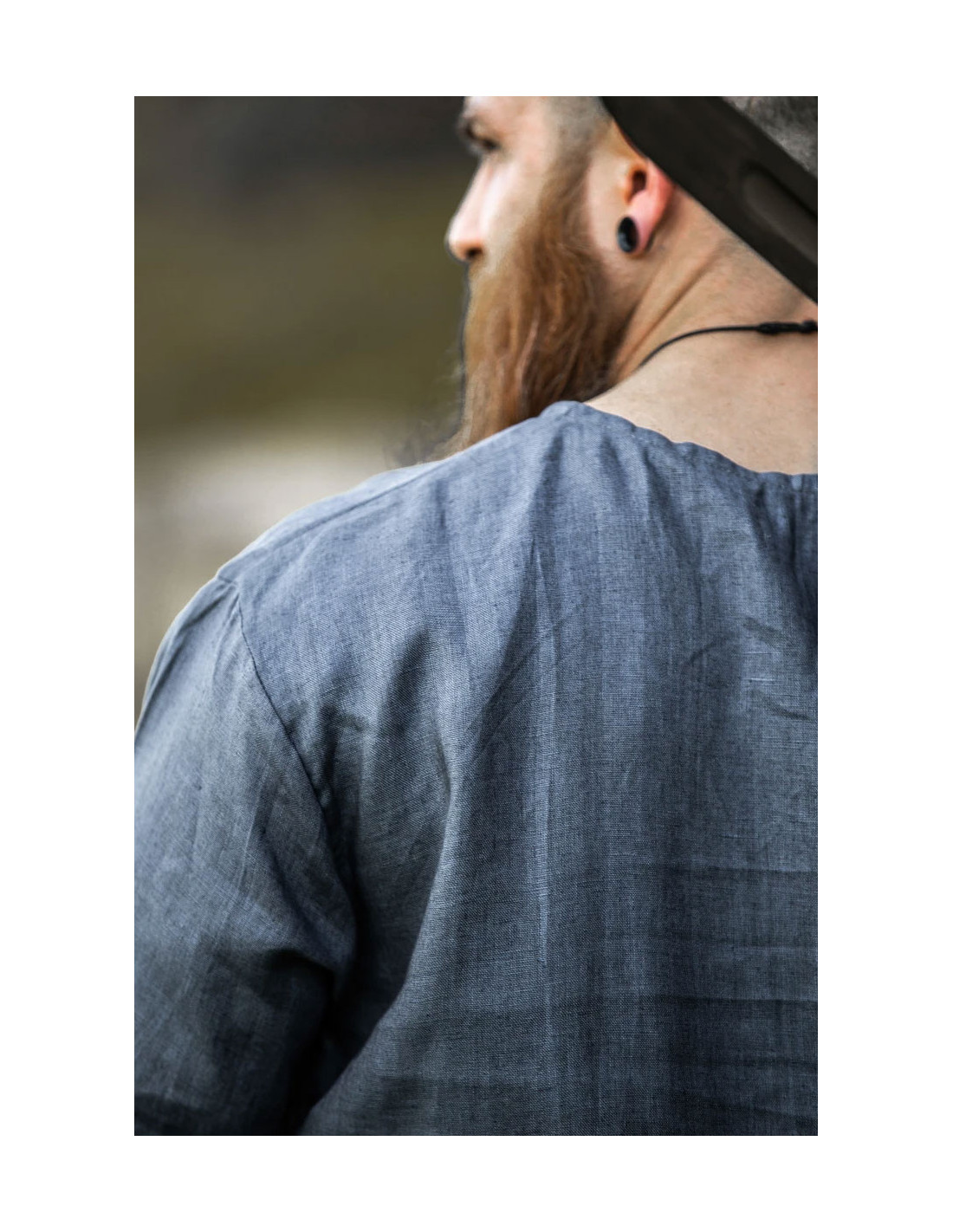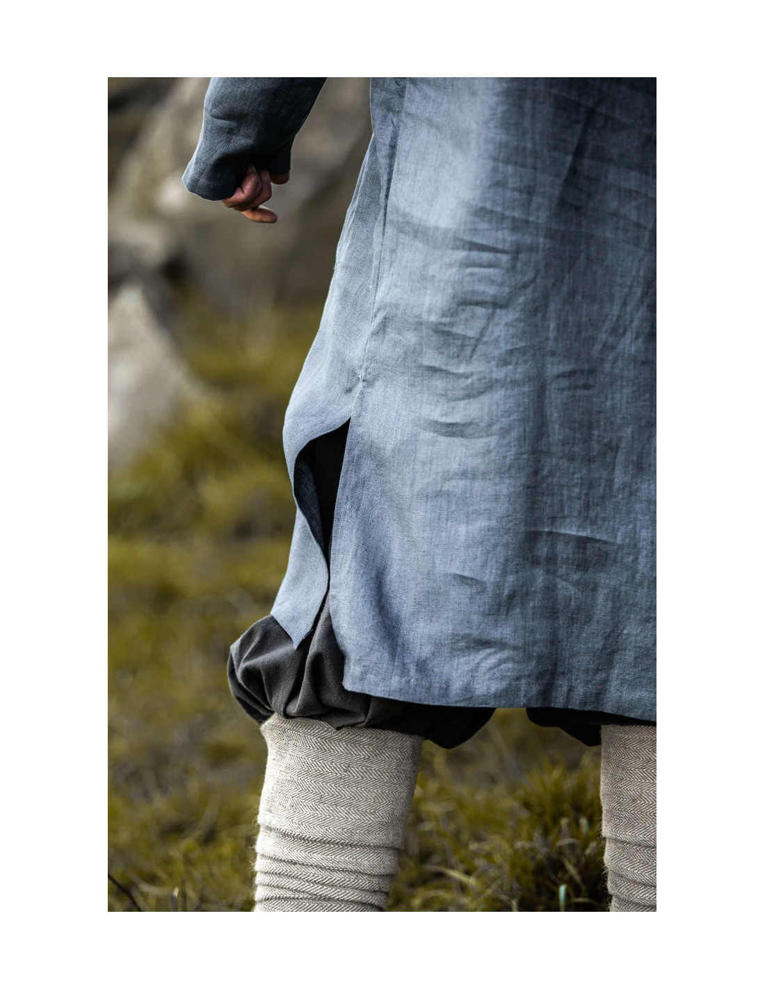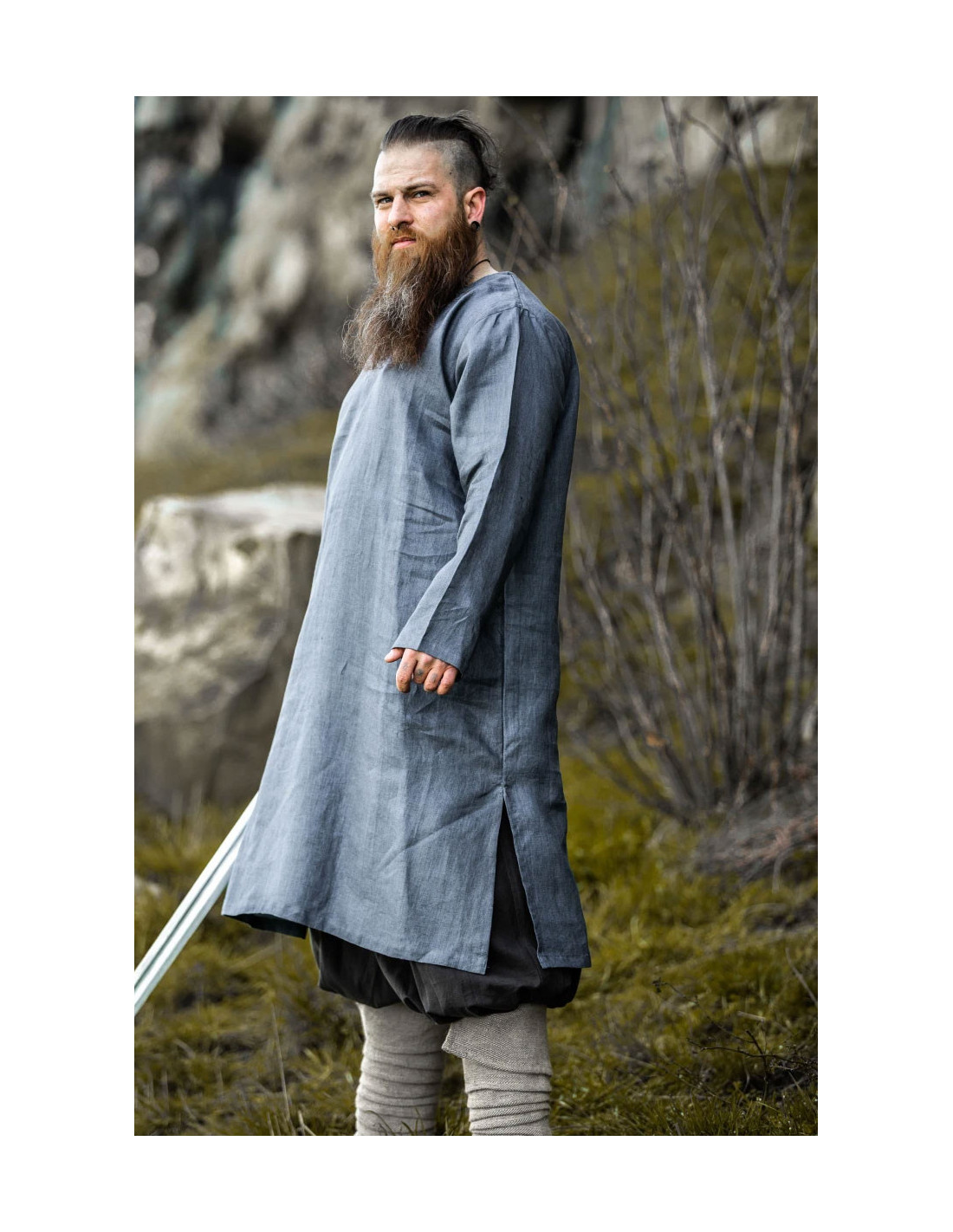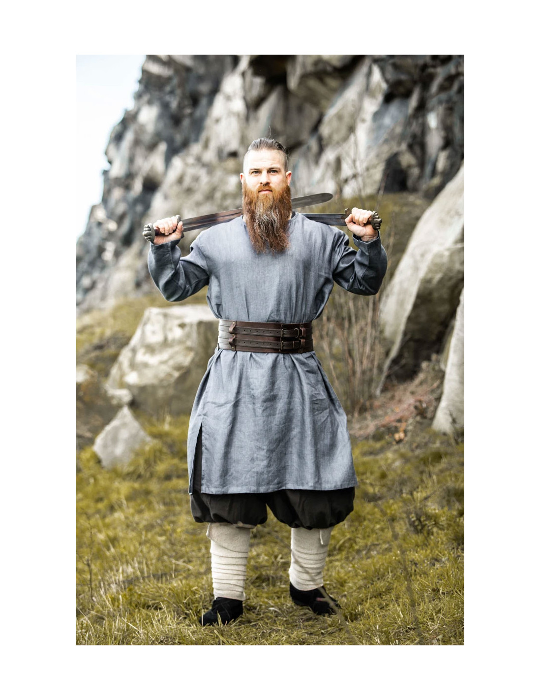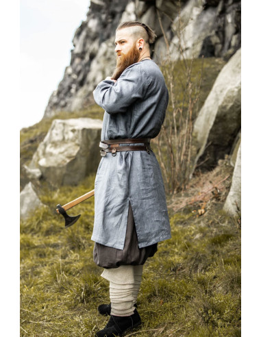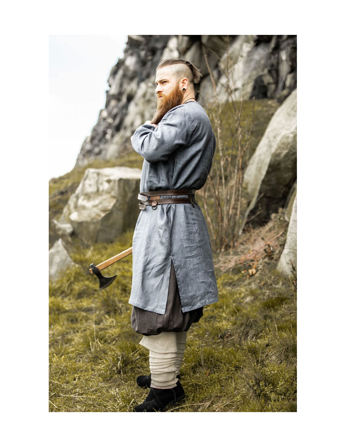 Deze grijze linnen tuniek is een veelzijdig kledingstuk, perfect voor LARP-evenementen, middeleeuwse markten, maar ook als aanvulling op een alledaagse Scandinavische outfit. De eenvoud en tijdloze elegantie zonder franjes of ingewikkelde details stelt u in staat om de Vikingwereld comfortabel en zonder concessies te doen aan verfijning te ervaren.