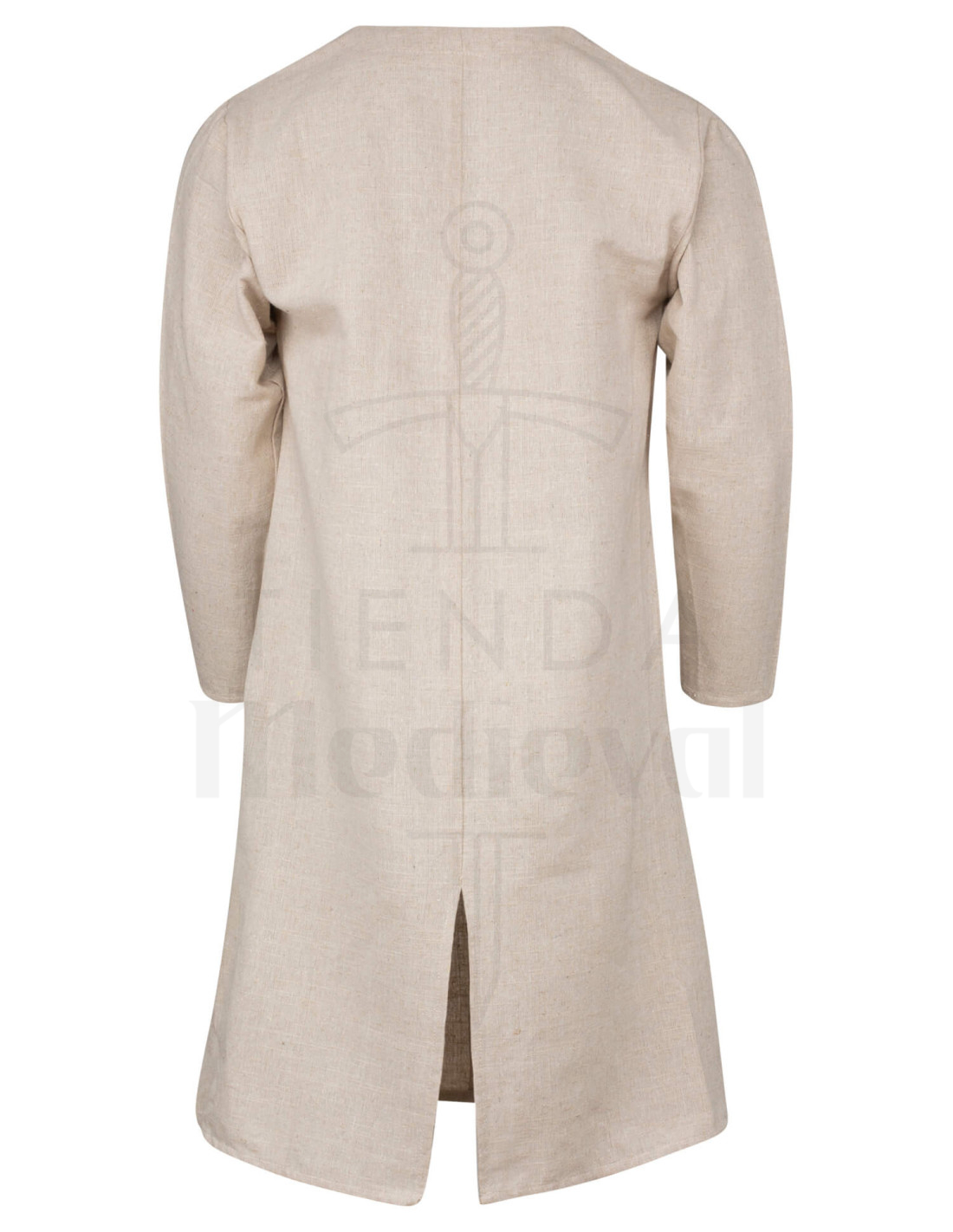 Gemaakt van een moderne mix van licht linnen, is deze tuniek ademend en koel, perfect voor de zomer, zonder zijn rustieke en elegante karakter te verliezen. De lichte beige tint geeft een natuurlijke en authentieke uitstraling, die de textielen uit die periode nabootst, terwijl het eenvoudige en ongecompliceerde ontwerp het ook geschikt maakt voor historische evenementen of culturele recreaties.