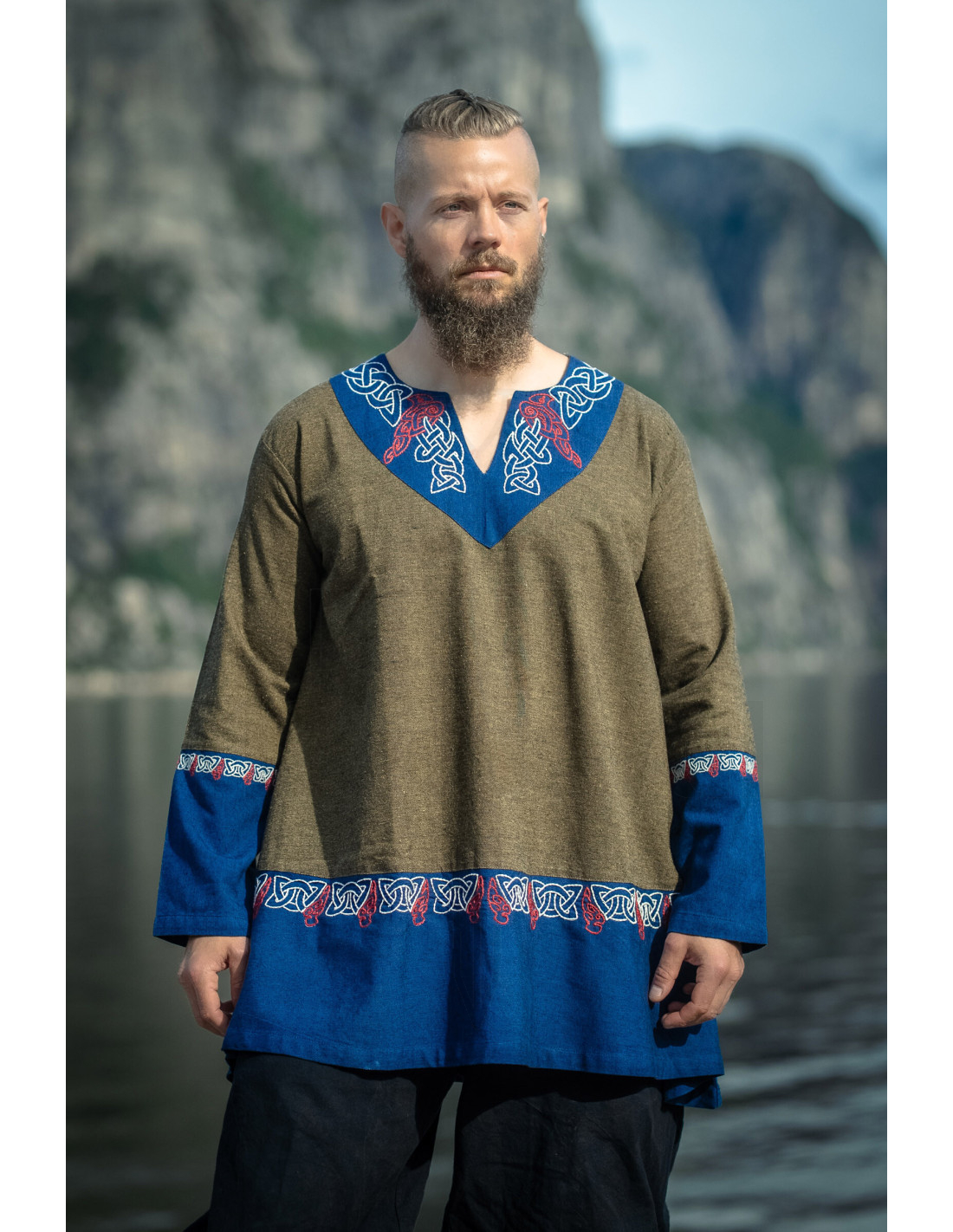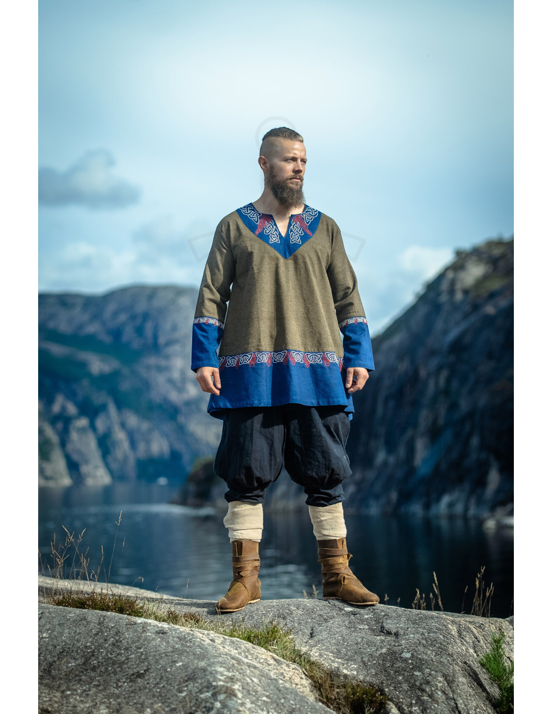 Als je de volgende stap wilt zetten en de Korte Viking Tuniek Model Freydis, Olijf-Blauw wilt kopen, zul je ontdekken dat deze goed te combineren is met eenvoudige accessoires om zijn heroïsche aura te versterken, of met moderne kledingstukken voor een eigentijds contrast.