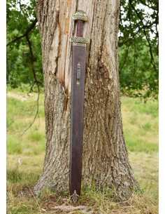 Dit vroeg-middeleeuwse eenhandige zwaard wordt compleet geleverd met een getailleerde schede van bruin leer en hout met een antiekkoperen hals, cape en gesp (maximale riembreedte 6 cm).