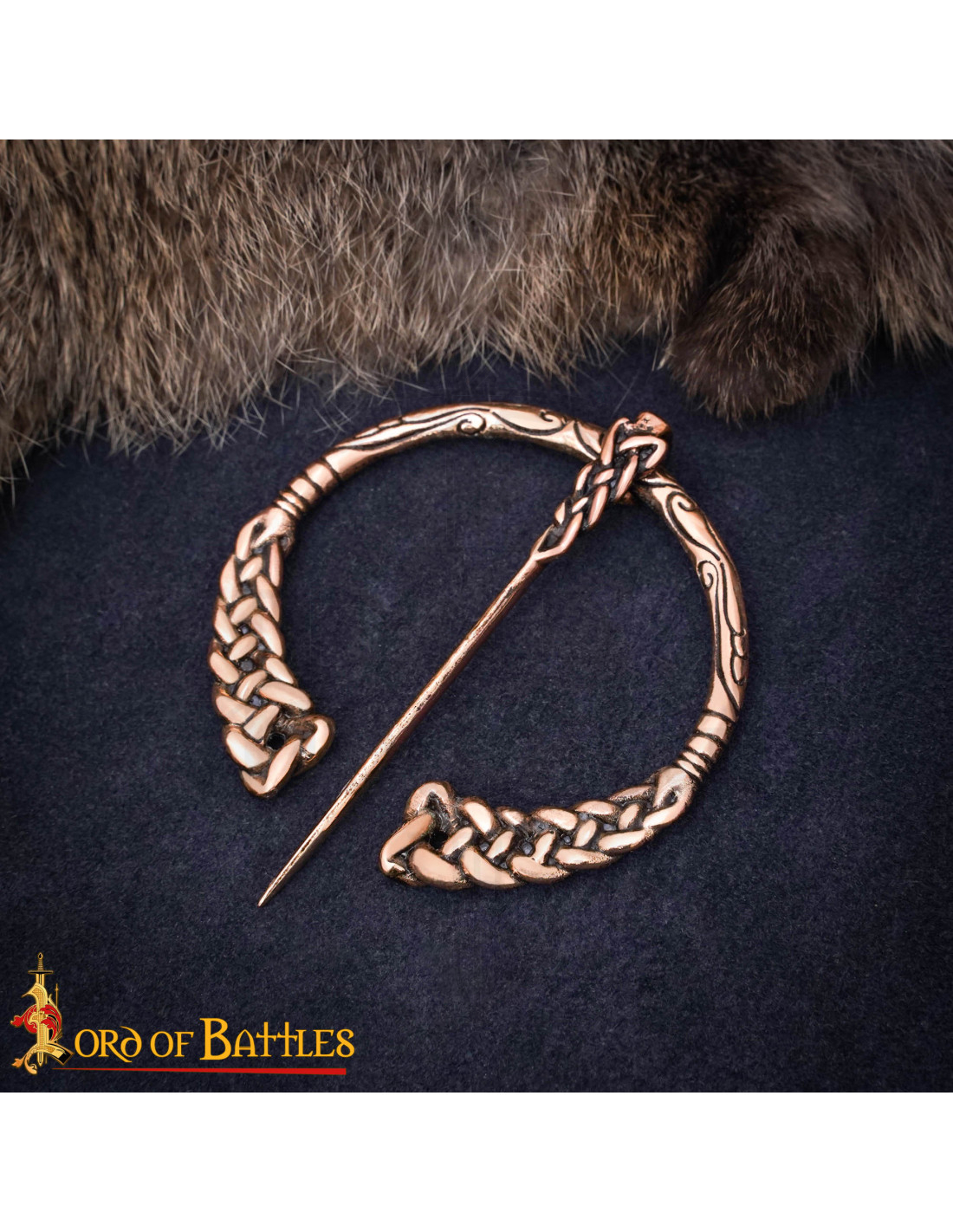 Het vlechtontwerp trekt de aandacht en, nog belangrijker, verzekert het sluiten met vertrouwen: de rechte speld glijdt in zijn houder om tunieken en mantels op hun plek te houden, zonder complicaties. De verouderde bronzen afwerking biedt een authentieke uitstraling die veroudert met jouw gebruik, met karakter en elegantie, zowel in historische recreaties als in dagelijkse looks.