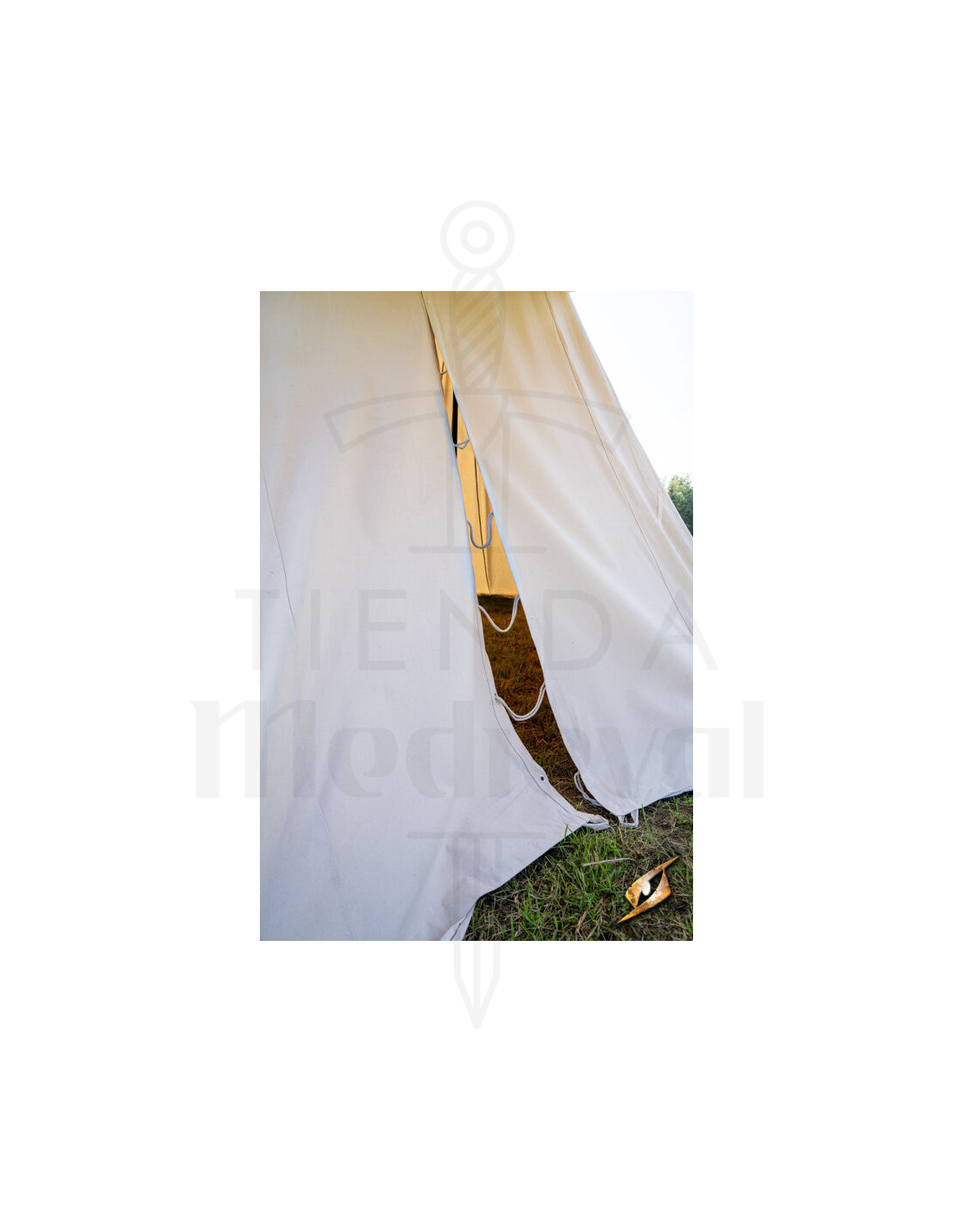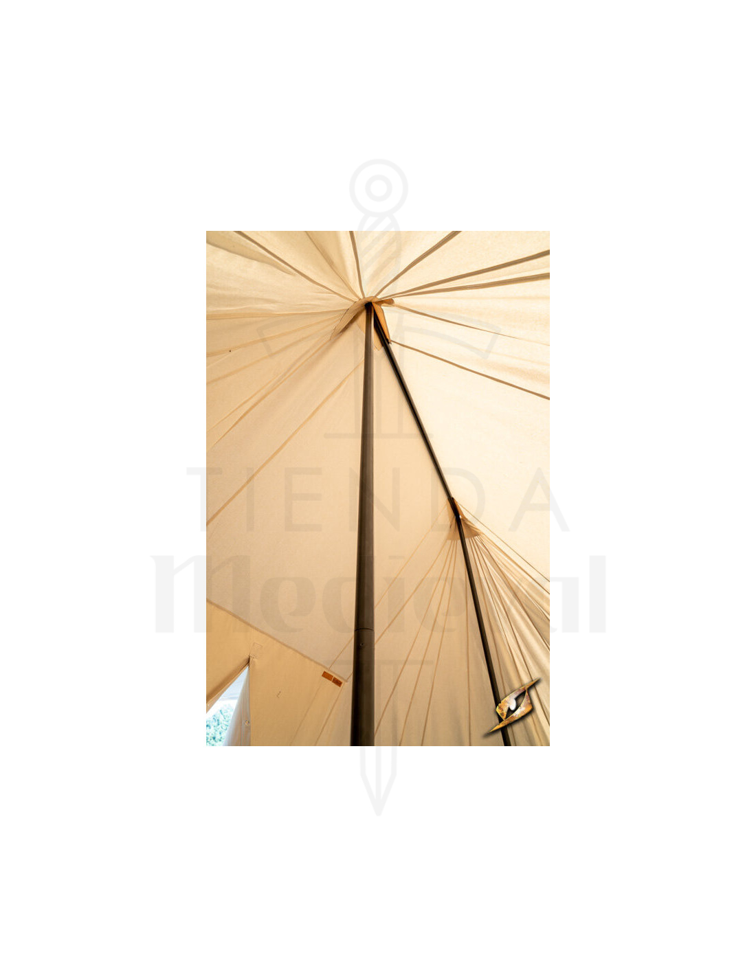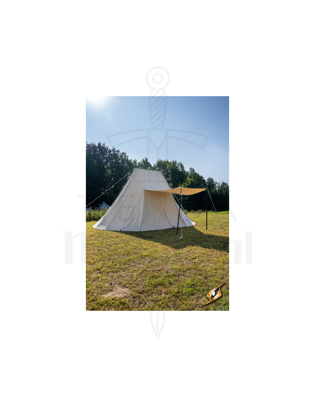 Met een levendige tweekleurige kleur bootst deze tent getrouw het uiterlijk na van de tenten die werden gebruikt in het tijdperk van gewapende ridders. De tentstructuur wordt ondersteund door gepoedercoate ijzeren palen, wat zorgt voor uitzonderlijke stevigheid en duurzaamheid. De stof, gemaakt van 100% katoen met hoge weerstand (425 g/m²) en behandeld met paraffinewas, zorgt voor superieure bescherming tegen slecht weer.