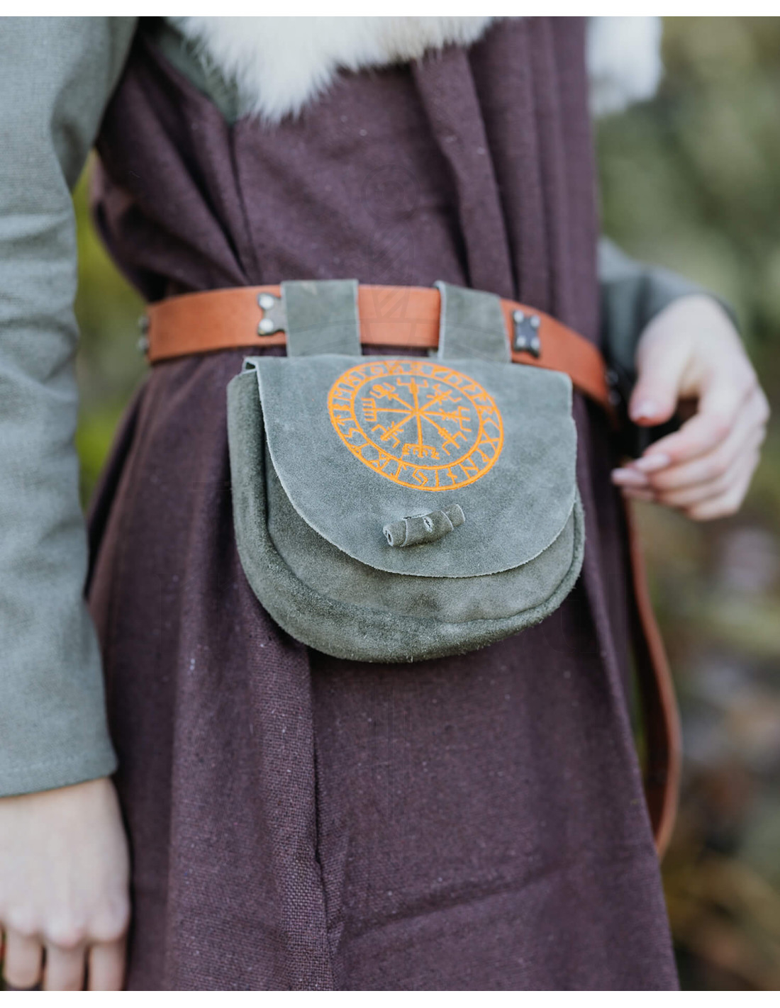 De afwerking in groen met oranje details zorgt voor een opvallend contrast, dat de symboliek en het karakter van het stuk benadrukt. Of het nu voor een Vikingkostuum, middeleeuwse outfit of gewoon om op te vallen met een uniek accessoire is, deze tas biedt de veelzijdigheid om er elke keer authentiek en anders uit te zien.