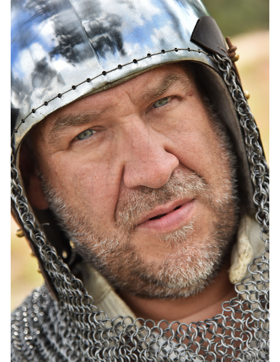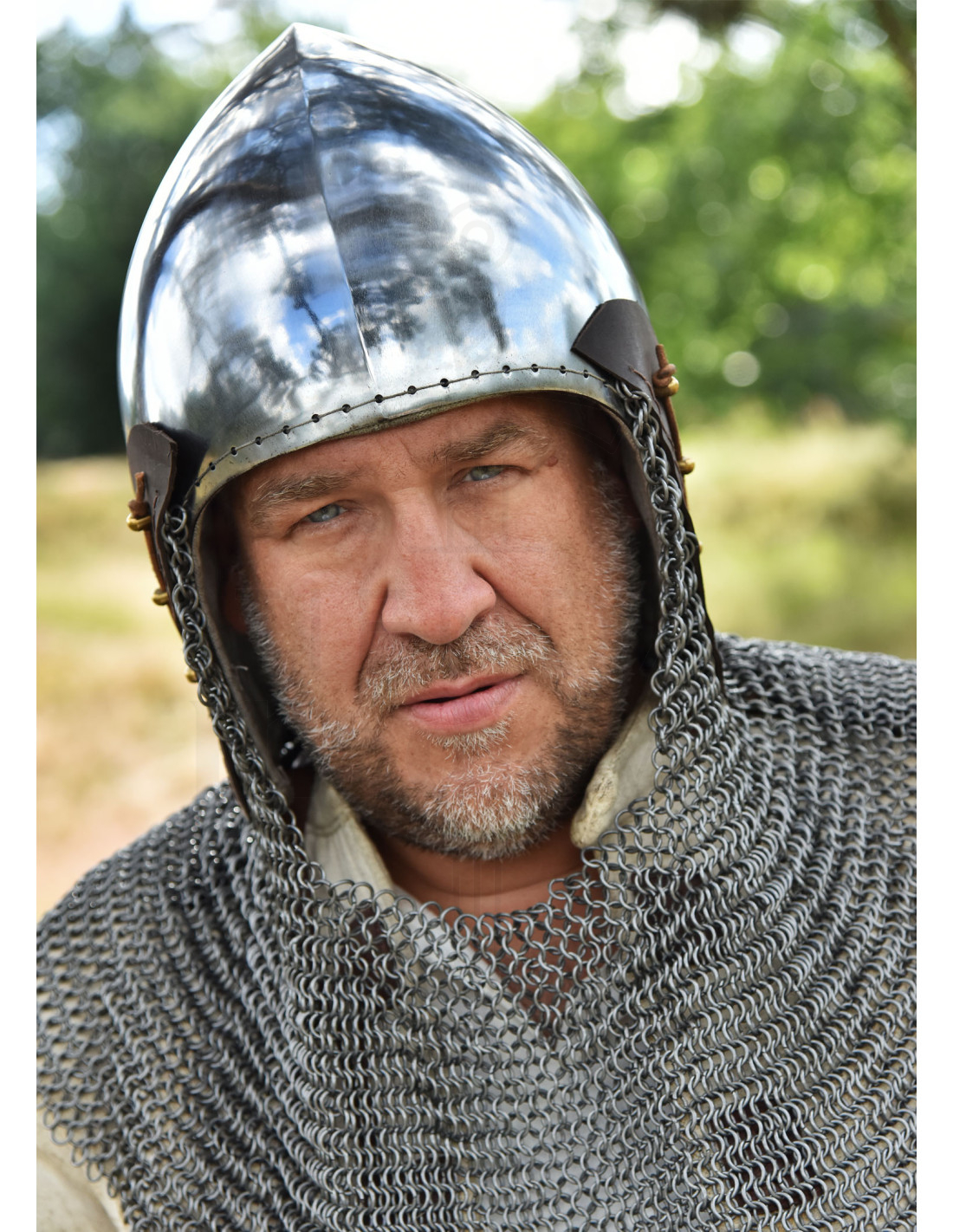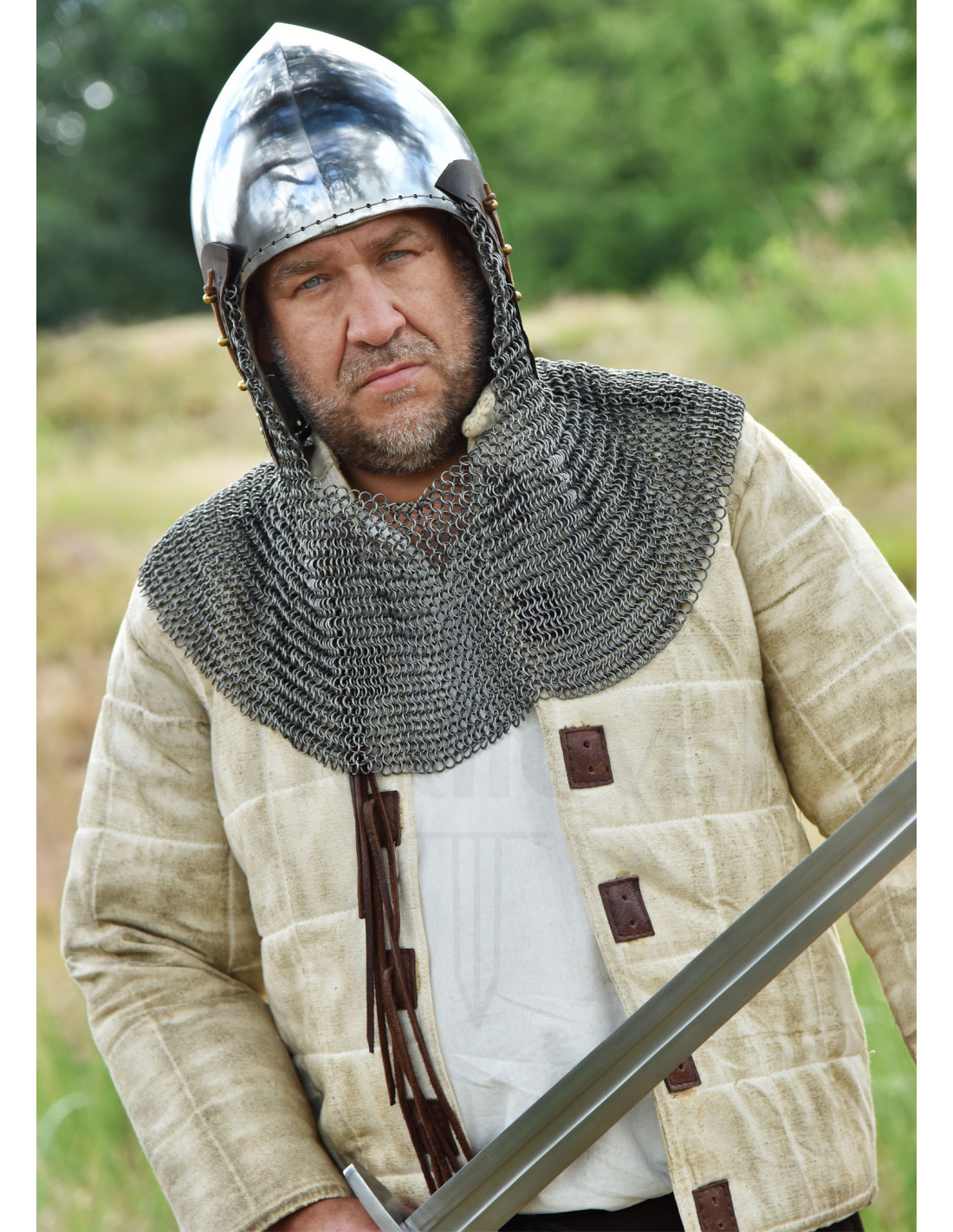 Maar wat deze bacinete echt bijzonder maakt, is zijn beul met platte ringen. Dit accessoire is bevestigd met oogjes en een leren koord en biedt uitstekende bescherming voor uw nek, zodat deze beschermd is tegen vijandelijke slagen en snijwonden. Nu kun je je tegenstanders met vertrouwen en veiligheid tegemoet treden.