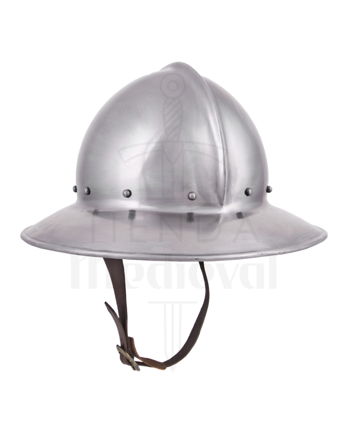 Gemaakt van stevig en versterkt staal, zorgt zijn robuuste structuur ervoor dat je klaar bent voor elke uitdaging, terwijl de zachte binnenvulling en de verstelbare leren riem zorgen voor een comfortabele en stabiele pasvorm gedurende uren. De brede rand versterkt niet alleen de klassieke stijl van de periode, maar beschermt ook effectief tegen zijwaartse klappen en onverwachte valpartijen.