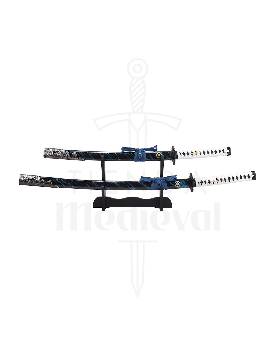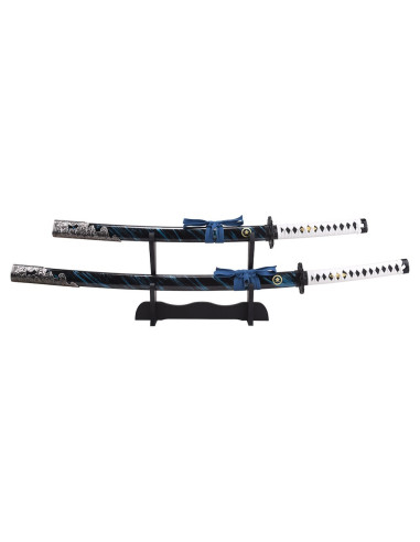 Perfect om je kantoor, woonkamer of gamingruimte te decoreren, stelt deze set katana en wakizashi je in staat om de samoerai-cultuur en Jin te eren, en je omgeving om te toveren tot een echt symbool van eer en moed.