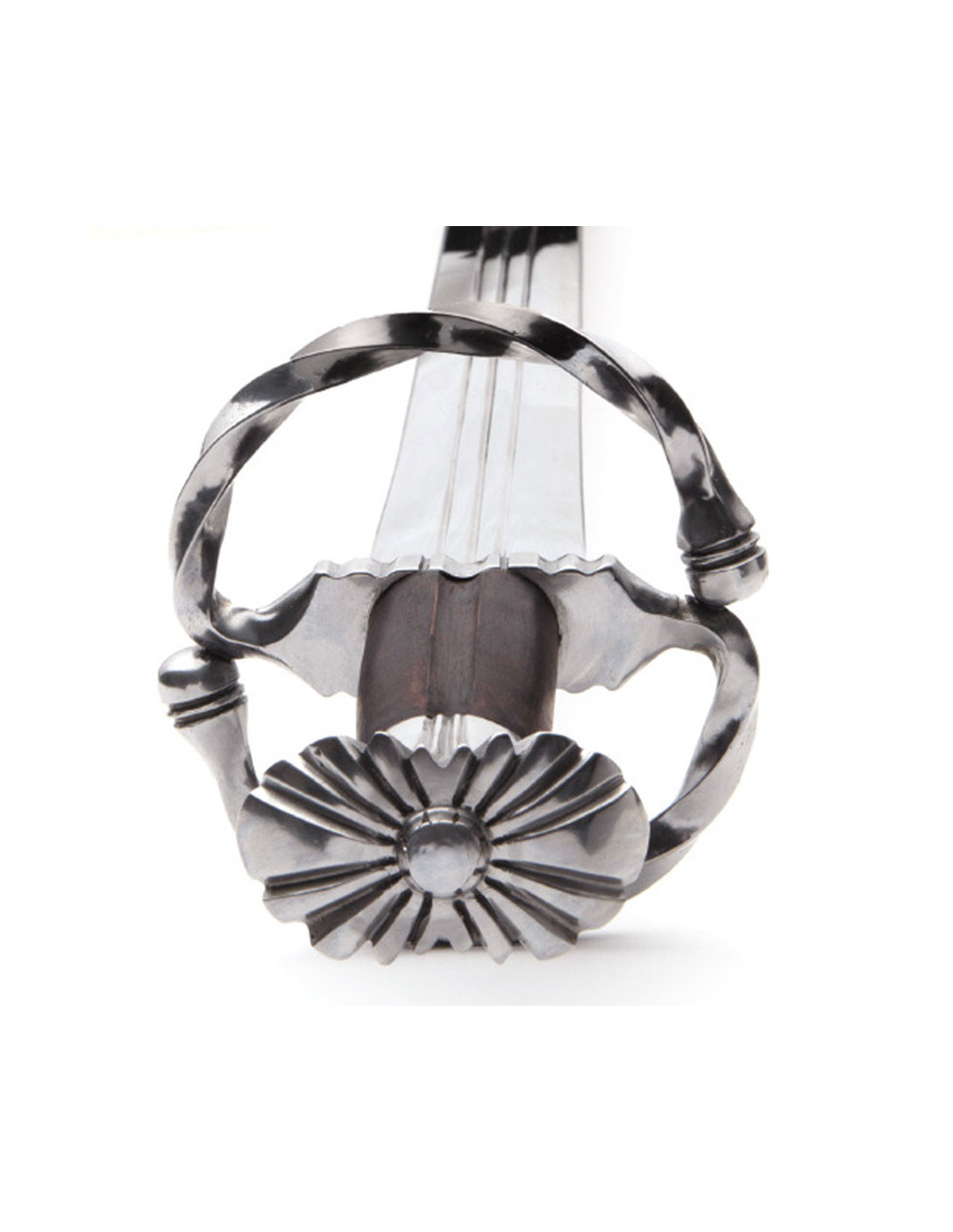 Dit zwaard heeft een prachtig vormgegeven greep die zeker de aandacht trekt van elke Landskecht. De pommel heeft een perfect verlengde karteling richting het houten handvat, terwijl de pareerstang vakkundig spiraalvormig is gedraaid en is afgewerkt met een halve bol.
