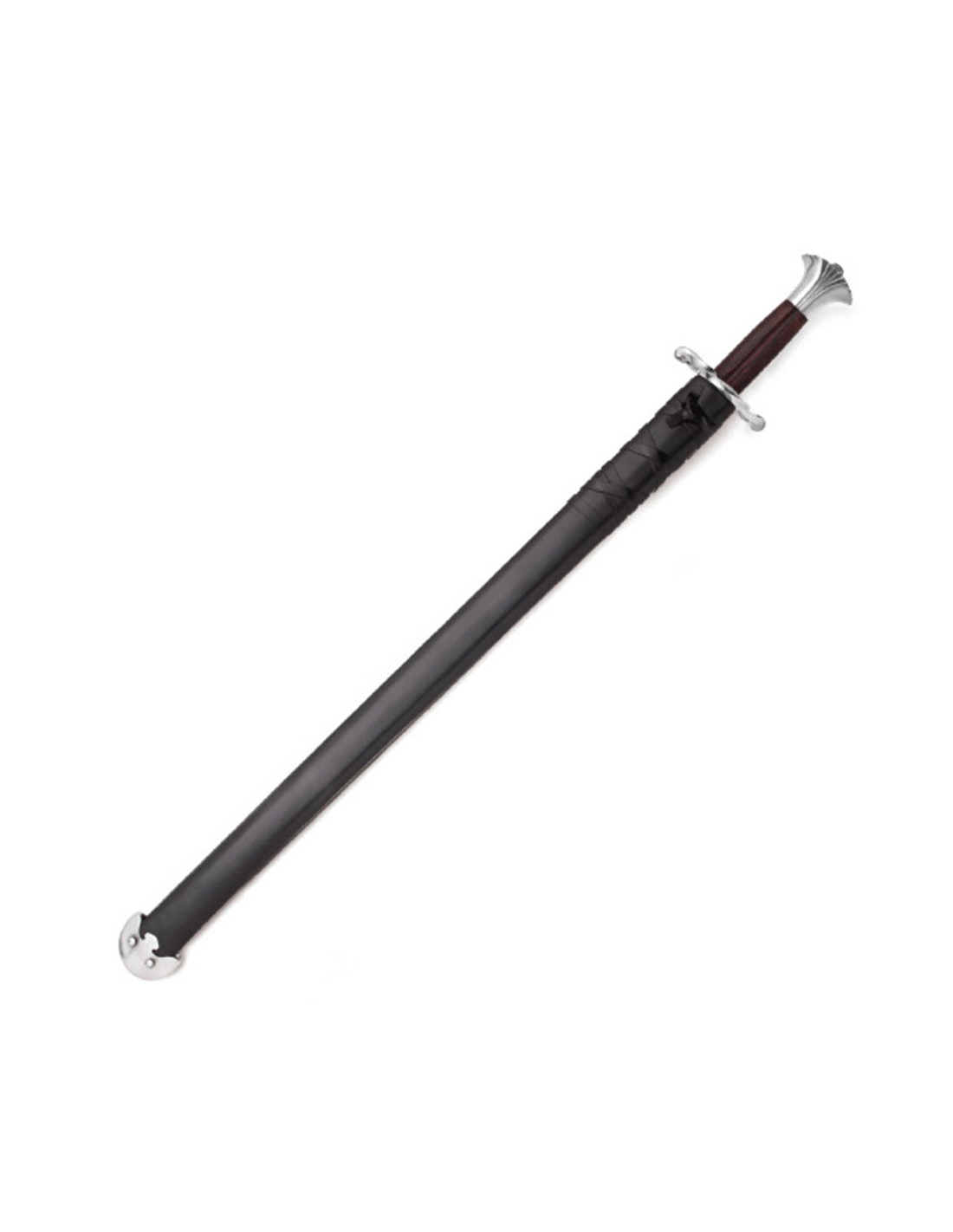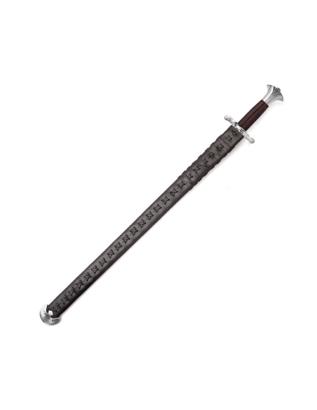 De zwart lederen schede is een ander hoogtepunt van dit zwaard. Het is versierd met gekruiste leren banden die bij de hals zijn geknoopt en afgewerkt met een unieke stalen punt. De beschermkap is 11 cm breed, zodat het zwaard veilig beschermd is wanneer het niet in gebruik is.