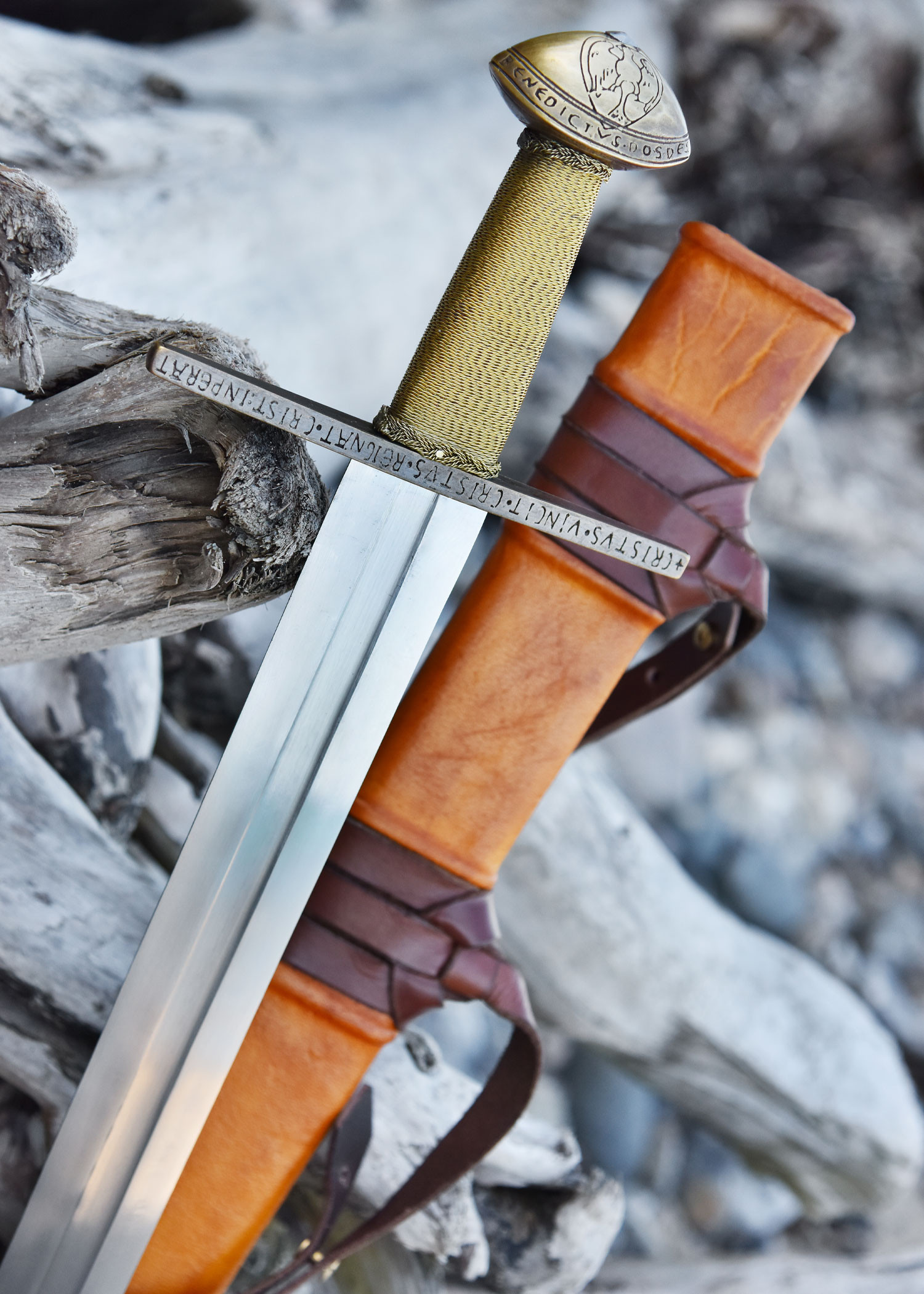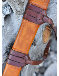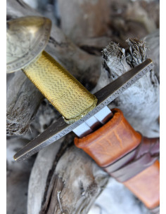 De houten schede omwikkeld met echt leer in een okerkleurige tint completeert de middeleeuwse esthetiek van dit meesterwerk. Met een totale lengte van ongeveer 104 cm en een lemmet van 90 cm is dit zwaard een juweeltje voor zowel verzamelaars als liefhebbers van geschiedenis.