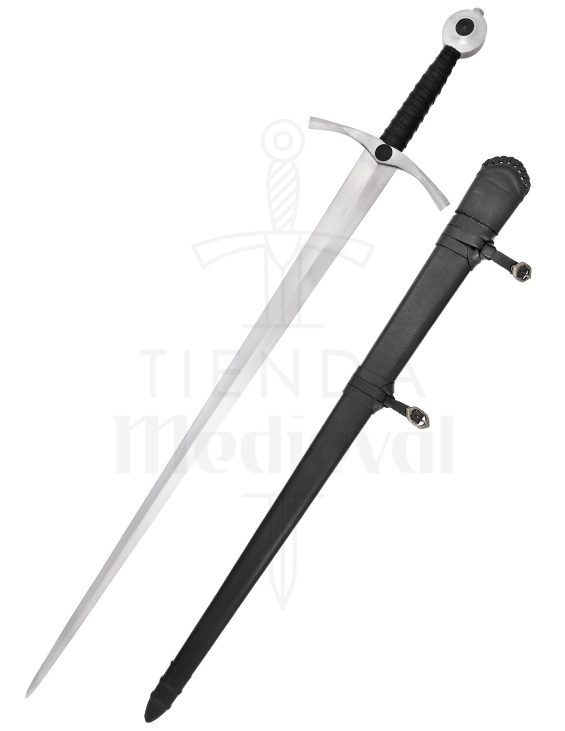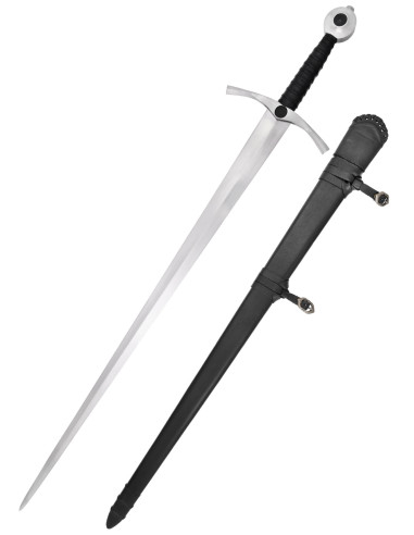 De handgreep, zorgvuldig omwikkeld met zwart leer, zorgt niet alleen voor een stevige en comfortabele grip, maar versterkt ook het traditionele ontwerp met metalen details die de adel en middeleeuwse kunst oproepen. Het kruis van het zwaard, met licht gebogen uiteinden richting het lemmet, voegt een vleugje onderscheid toe en functionaliteit toe, terwijl de ronde knop het geheel elegant afsluit.