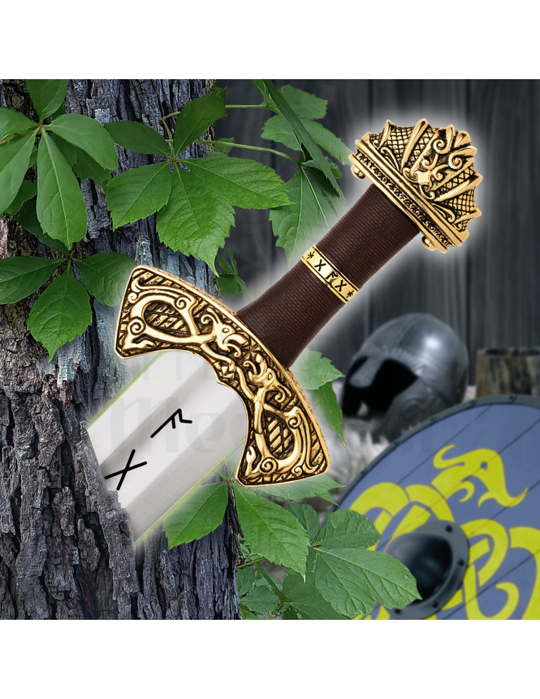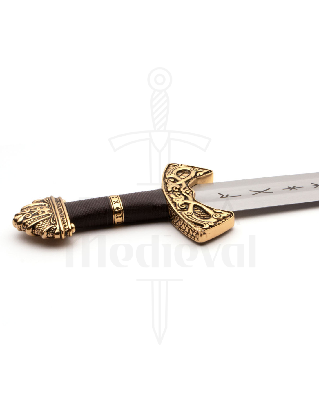 Geïnspireerd door het legendarische zwaard uit de Noorse mythologie, beschikt deze hoogwaardige replica over een hoogcarbonstalen blad van 1075, glanzend en met gravures die de kracht en majesteit van de mythos weerspiegelen. Met een uitgebalanceerd gewicht en een balanspunt slechts 14 cm van de guard, biedt het een nauwkeurige en comfortabele hantering, ideaal om te tonen of zelfs voor het beoefenen van historische krijgskunsten.