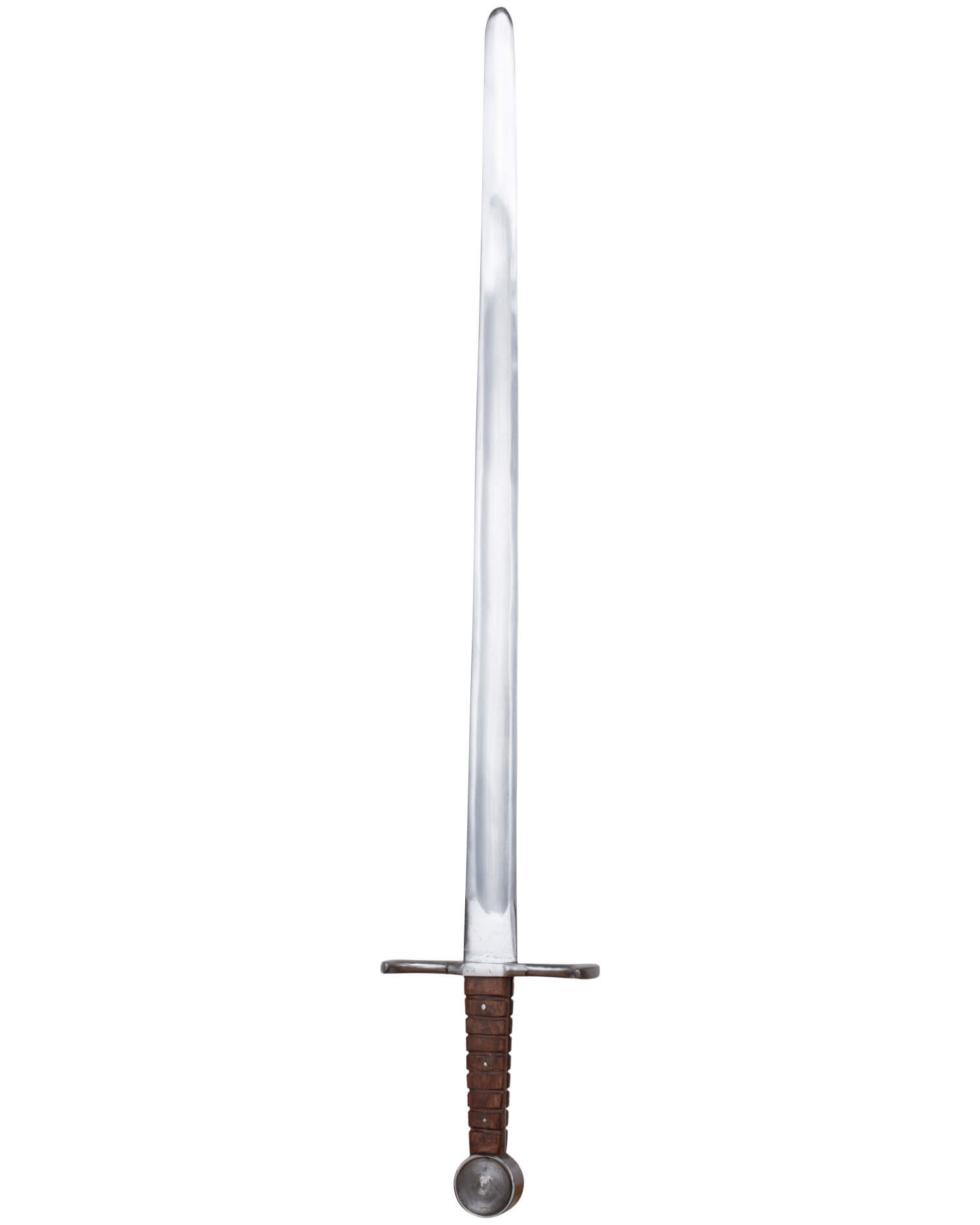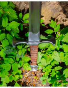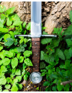 De afbeelding toont een stuk in uitstekende staat, met een glad en glanzend metalen blad dat contrasteert met het stevige bruine handvat, omwikkeld met synthetisch leer voor een stevige en comfortabele grip. Perfect voor liefhebbers en professionals die een replica van hoge kwaliteit willen tonen of deelnemen aan voorstellingen, is dit zwaard jouw bondgenoot om de legendes van vroeger met stijl en veiligheid te recreëren.