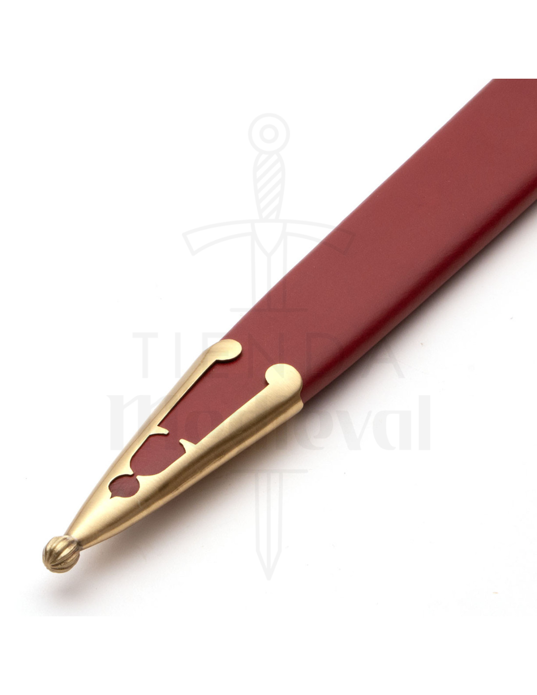 De facetzijde van het messing, naast zijn zichtbare aanwezigheid, omvat een gemonteerd blok dat de tang verlengt, wat het demonteren en toekomstige ingrepen vergemakkelijkt en de levensduur en aanpassingsvermogen aan het stuk toevoegt. De combinatie van het handvat en de schede in rood met messing details suggereert rang en onderscheid, en biedt een samenhangende en elegante afwerking die het zwaard beschermt en het op elke tentoonstelling laat opvallen.