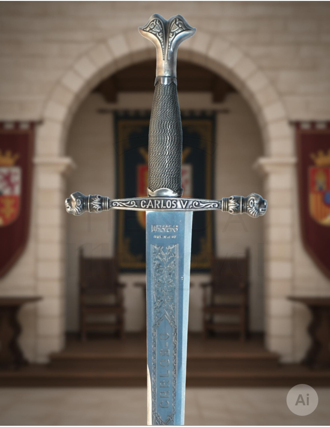 Mis de kans niet om dit magnifieke zwaard te bezitten dat de nalatenschap van Carlos V vertegenwoordigt. Haal het jouwe nu en voeg een vleugje grootsheid toe aan je collectie!