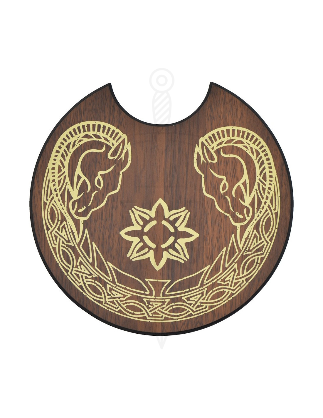 De meegeleverde standaard is niet alleen een accessoire, het is een onderdeel van het geheel: donker hout met een fijne afwerking en gouden versieringen, twee tegenovergestelde koppen en een motief in het midden als een ster of bloem, die het stuk verticaal vasthouden en transformeren in een impactvol decoratief element. Het plaatsen van het zwaard in zijn standaard is eenvoudig, en het geheel wint aan aanwezigheid zonder complexe montage te vereisen.
