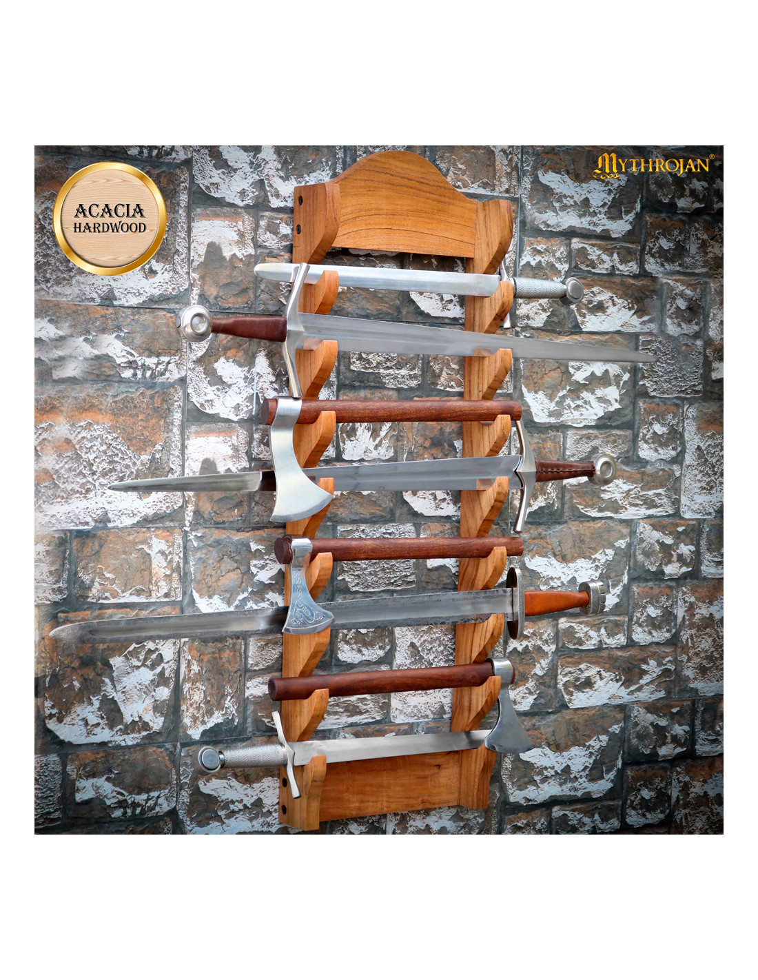 De massief houten muurbeugel van Mythrojan is de perfecte oplossing om uw zwaarden of katana's elegant en veilig te presenteren. Met de capaciteit om maximaal 8 zwaarden horizontaal op te hangen, kunt u met deze houder uw verzameling op een georganiseerde manier tentoonstellen en de schoonheid van elk stuk benadrukken.