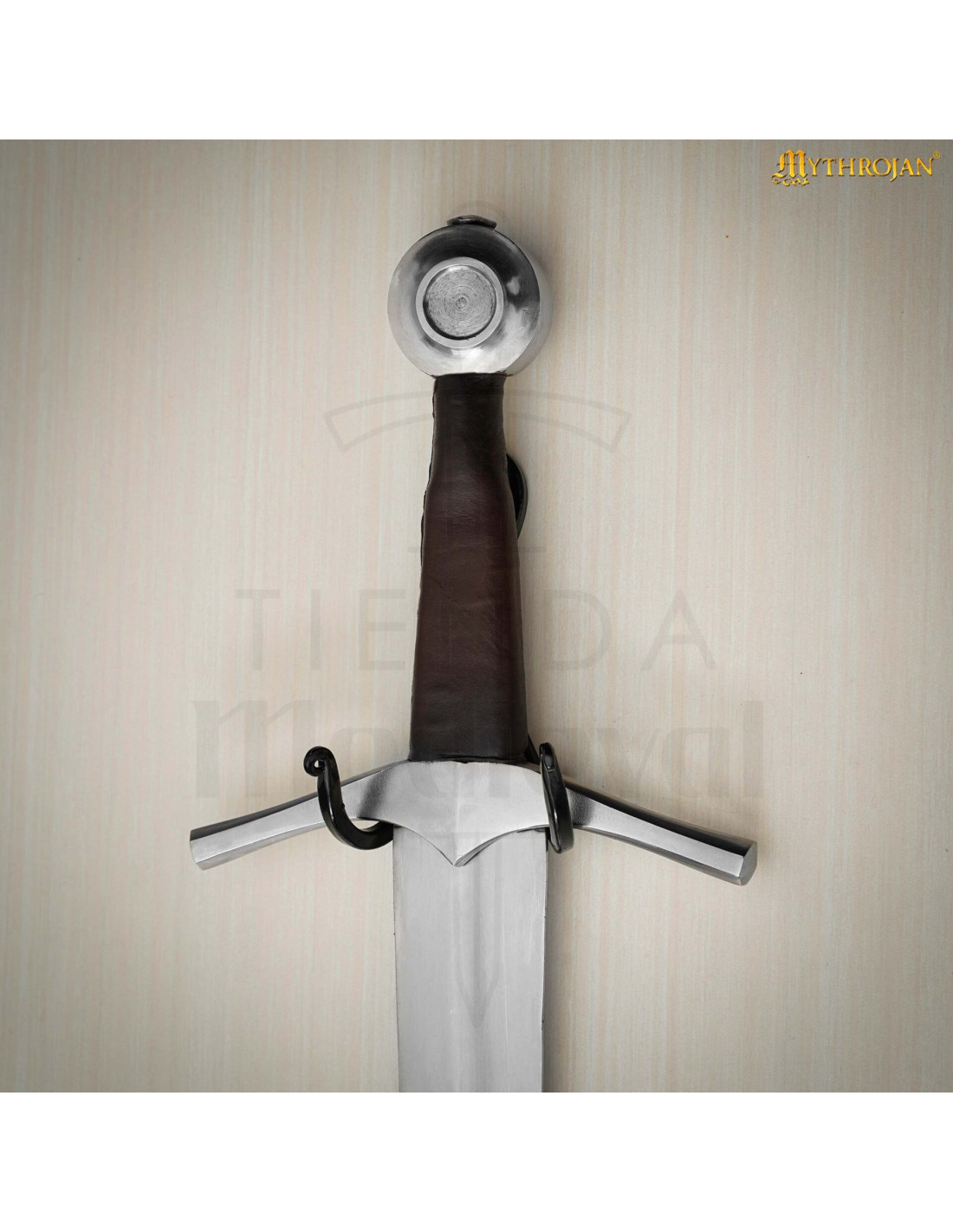 Transformeer de manier waarop je je zwaarden tentoonstelt met een wandbeugel van smeedijzer, een stuk dat kracht en middeleeuwse stijl combineert in één element. Met de hand vervaardigd door gespecialiseerde ambachtslieden, is deze beugel gemaakt van massief ijzer, wat zorgt voor een robuuste structuur die zelfs de zwaarste wapens kan dragen zonder te vervormen of te breken, zodat je volledig vertrouwen hebt in de duurzaamheid.