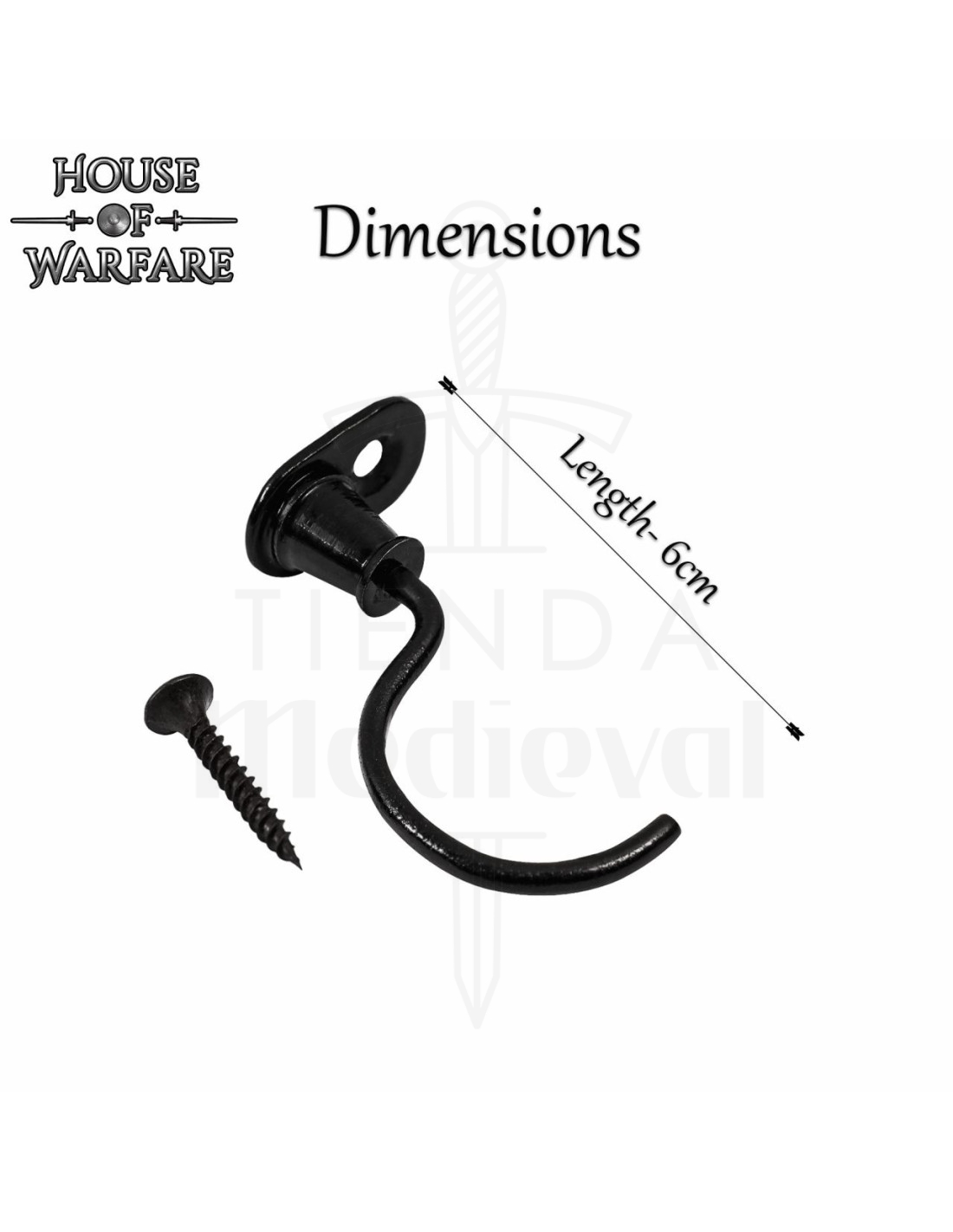 Dit paar middeleeuwse steunen biedt een kant-en-klare oplossing voor wie een middeleeuwse touch wil zonder in te boeten op veiligheid. De zwarte afwerking zorgt voor discretie en elegantie, waardoor de stukken die je ophangt opvallen zonder te concurreren met de decoratie. De 'U'-vormige bocht houdt de objecten vast en voorkomt dat ze wegglijden, terwijl de basis met een bevestigingsgat een stabiele montage op verticale oppervlakken garandeert.