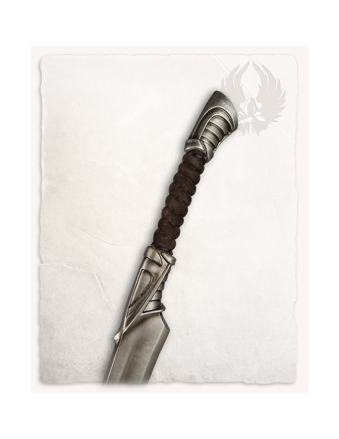 - Organisch en fantastisch ontwerp: het 'Yorveth'-zwaard heeft een ontwerp dat de natuur en fantasie oproept. De licht hellende pommel en gebogen pareerstang hebben fantastische contouren en ongebruikelijke vormen die doen denken aan het lichaam van een insect of de schubben van een draak.
