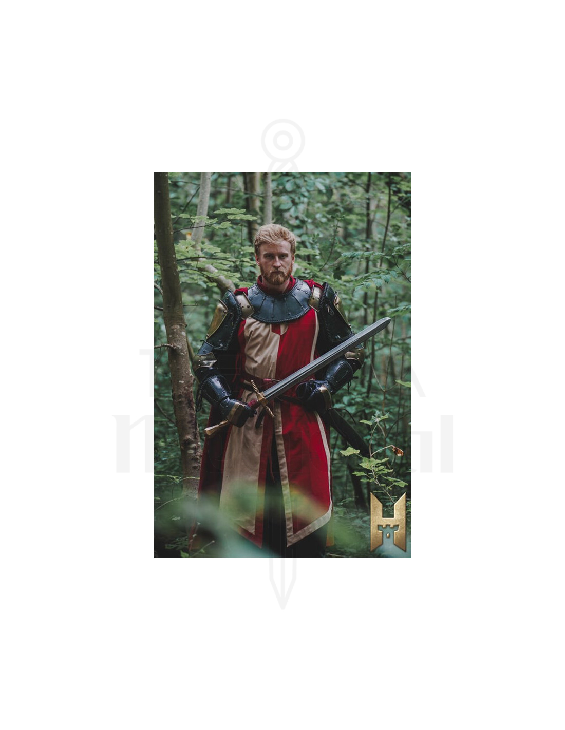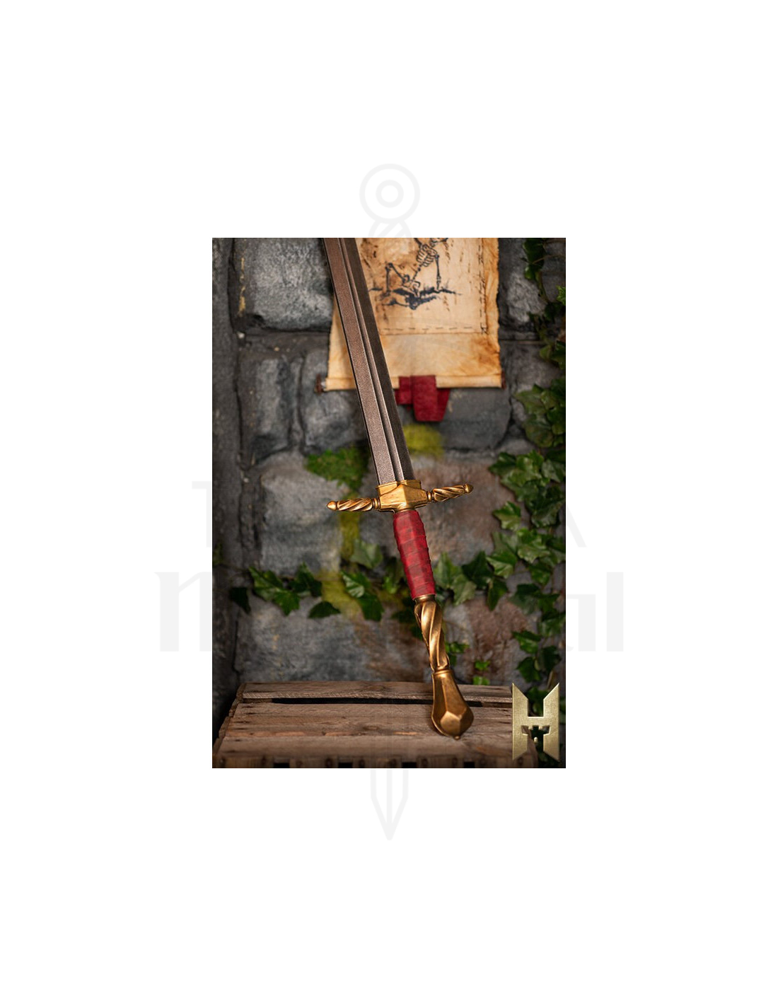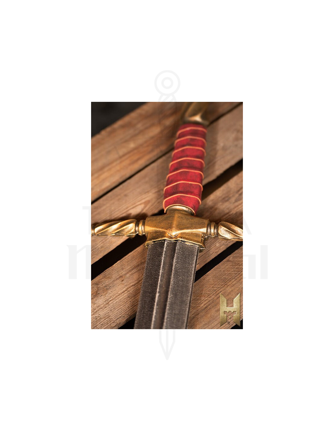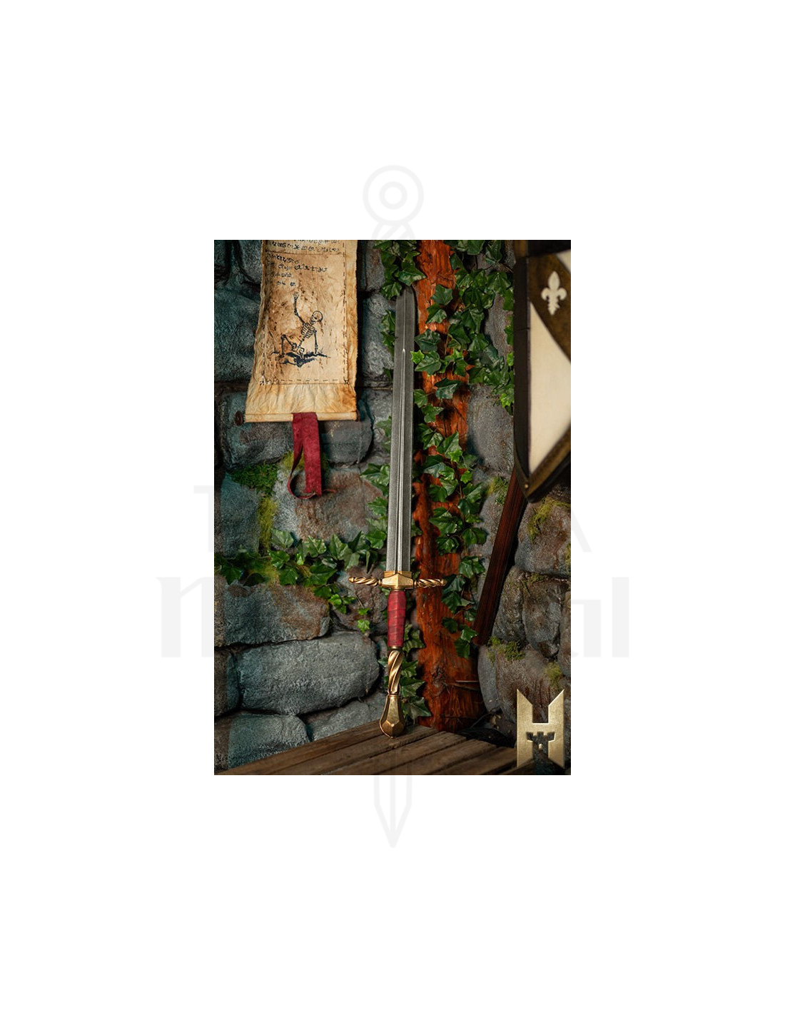 De handgreep, bekleed met leer, combineert comfort en controle, terwijl de gouden guard en pommel, met verfijnd en afgerond ontwerp, een decoratief accent toevoegen dat verwijst naar legendarische ridders en krijgers. De ovale vorm maakt snelle bewegingen mogelijk en de dramatische esthetiek roept een erfenis op van loyale en overwinnende krijgers.