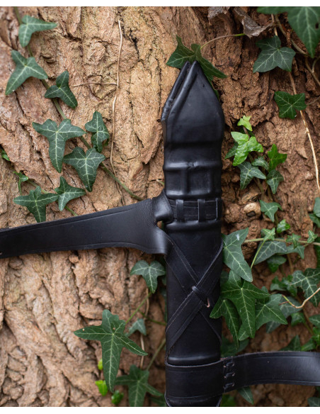 Dankzij de gekruiste riemen en de brede riem met een geïntegreerde metalen gesp, past de schede snel om de taille en blijft deze stabiel tijdens het lopen of tijdens een dynamische scène. Een secundaire, dunnere riem zorgt ervoor dat het wapen binnen de hoes blijft, waardoor ongewenste bewegingen worden vermeden en extra veiligheid wordt geboden bij toneelgevechten of tijdens parades.