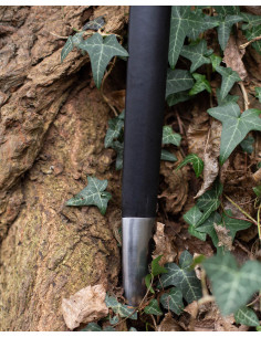 Het goed uitgebalanceerde ontwerp en de zorgvuldige afwerking zorgen ervoor dat het combineert met een breed scala aan historische kleding en wapenrusting, waarmee een realistisch en visueel coherente uitstraling wordt gegeven. In verticale positie geplaatst op een stam met bladeren, versterkt het een rustieke en authentieke esthetiek, ideaal voor foto's, evenementen en presentaties.